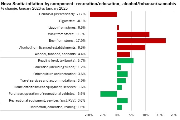Nova Scotia's prices for alcohol, tobacco and recreational cannabis were up 4.4% year-over-year, with an increase in prices for beer and wine from stores and alcohol from licensed establishments partially offset by declines in cigarettes and recreational cannabis.