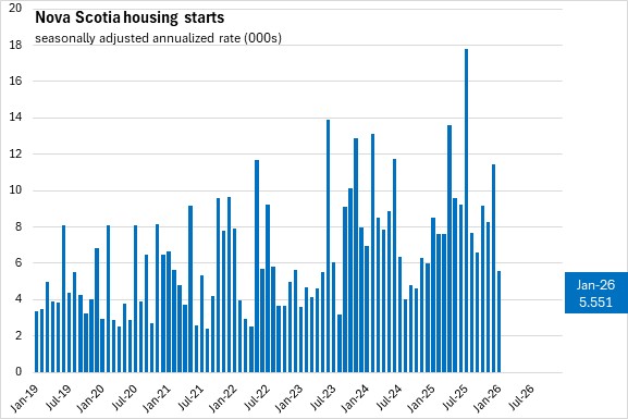 Nova Scotia’s housing starts (seasonally adjusted annualized rate) totalled 5,551 units in January 2026. This was a 51.5% decrease from the previous month's revised value of 11,456 starts.