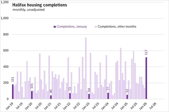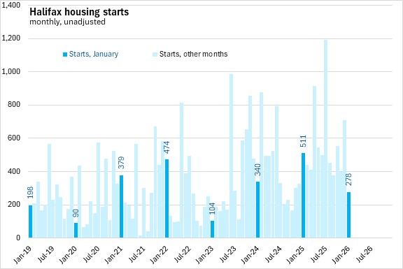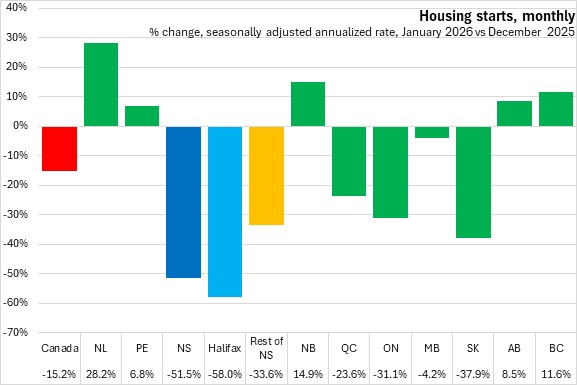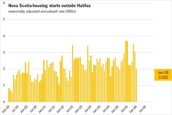 Outside of Halifax, housing starts declined to a seasonally adjusted annualized rate of 2,022 units in January 2026, down 33.6% from 3,045 units in December 2025.