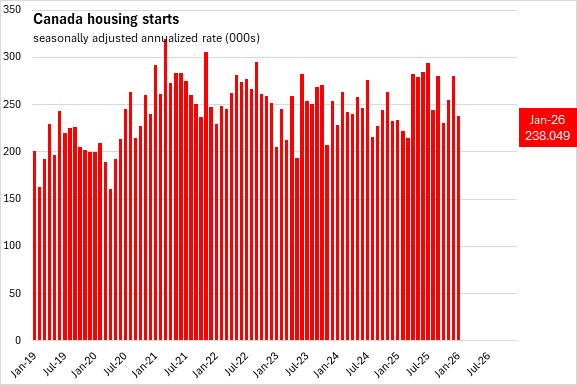 Across Canada, housing starts fell to a seasonally adjusted annualized rate of 238,049 units in January 2026, down 15.2% from 280,668 units reported in December 2025.