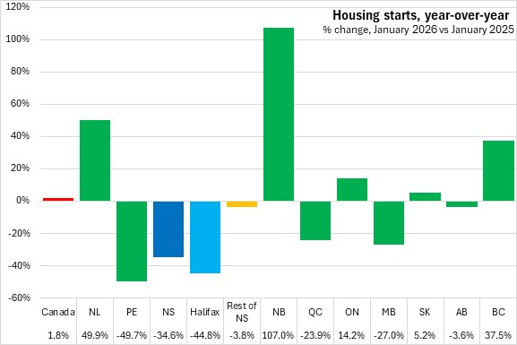 Nova Scotia's housing starts were down 34.6% compared with the 8,493 unit pace set in January 2025. Halifax housing starts were down 44.8% from their rate in January 2025 (6,392). Housing starts outside the city were down 3.8% year-over-year from their pace in January 2025 (2,101). Across Canada, housing starts were up 1.8% year-over-year in January 2026 with gains in five provinces, led by New Brunswick. Prince Edward Island reported the steepest year-over-year decline in housing starts (followed by Nova Scotia).