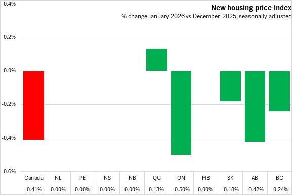 New housing prices in Nova Scotia were unchanged from December 2025 to January 2026. Nationally the price of new houses was down 0.41%, with growth in Québec offset by declines in four other provinces. The fastest monthly decline was reported in Ontario.
