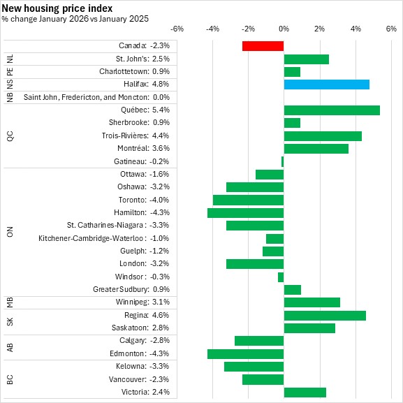 Nova Scotia’s new housing prices increased 4.8% from January 2025 to January 2026. Nationally, prices were down 2.3%.