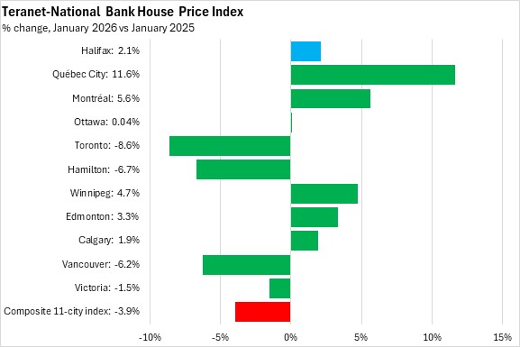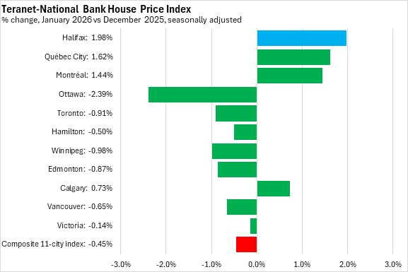 Halifax resale home prices, as measured by the Teranet-National Bank House Price Index (seasonally adjusted), rose 1.98% from December 2025 to January 2026, the fastest gain among cities.