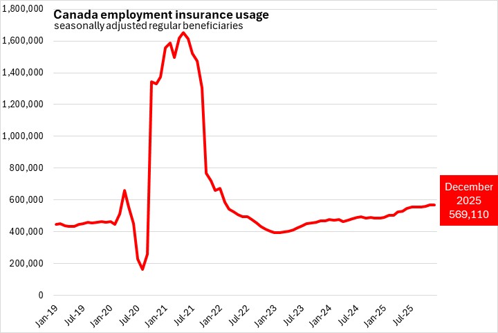 There were 569,110 Canadians that received regular employment insurance benefits in December 2025 (seasonally adjusted), an increase of 2,470 (+0.4%) from the revised November 2025 value.