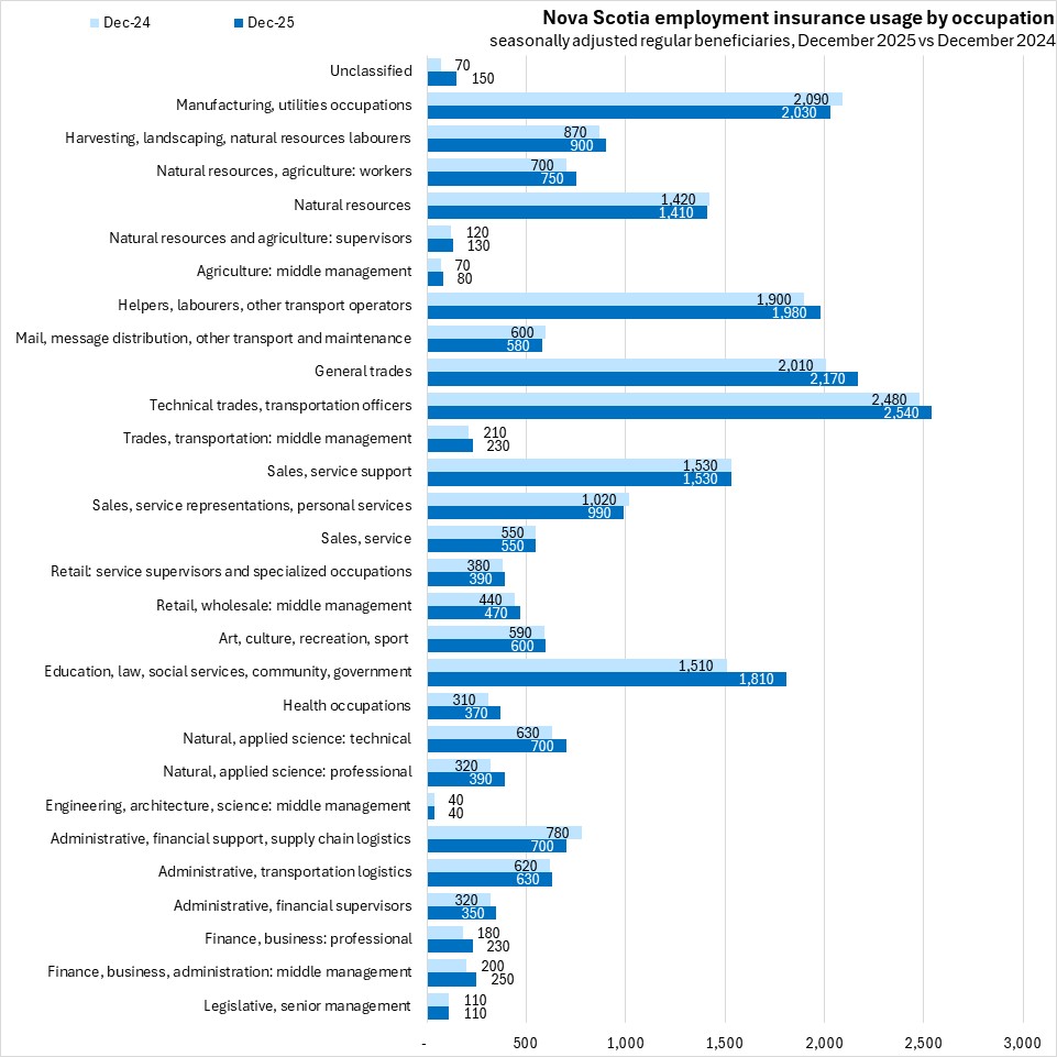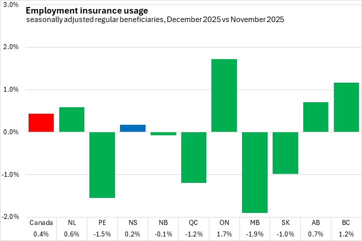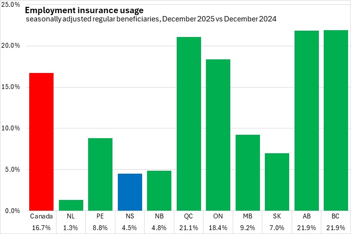 Compared to December 2024, Nova Scotia's employment insurance usage rose 4.5% (+1,000). National employment insurance usage increased 16.7% (+81,470) compared to December 2024. All provinces reported higher employment insurance compared to one year ago, with the fastest growth reported in Alberta and British Columbia, and the slowest in Newfoundland and Labrador.
