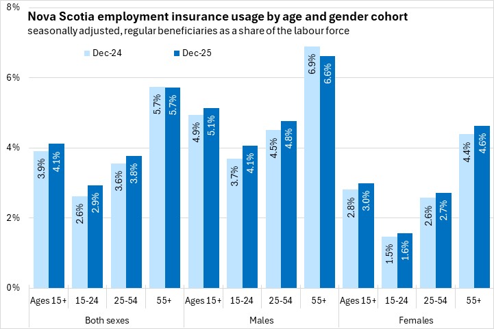 Use of employment insurance (as a share of the labour force) was lowest for youth (15-24) and highest for workers age 55 and over. Male use of employment insurance was higher as a share of the labour force than female use of employment insurance for all age cohorts in December 2025. Compared to one year ago, employment insurance usage as a share of the labour force was higher for all age and sex cohorts with the exception of males over the age of 55.