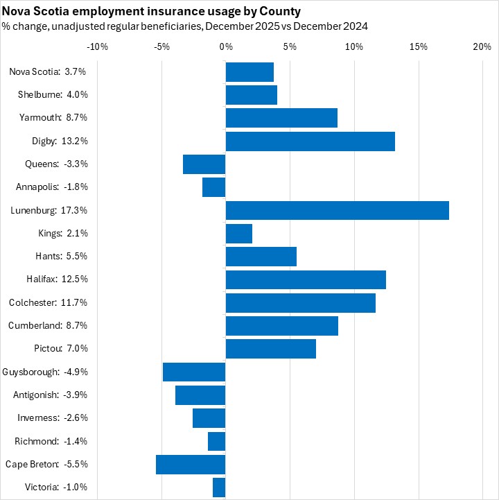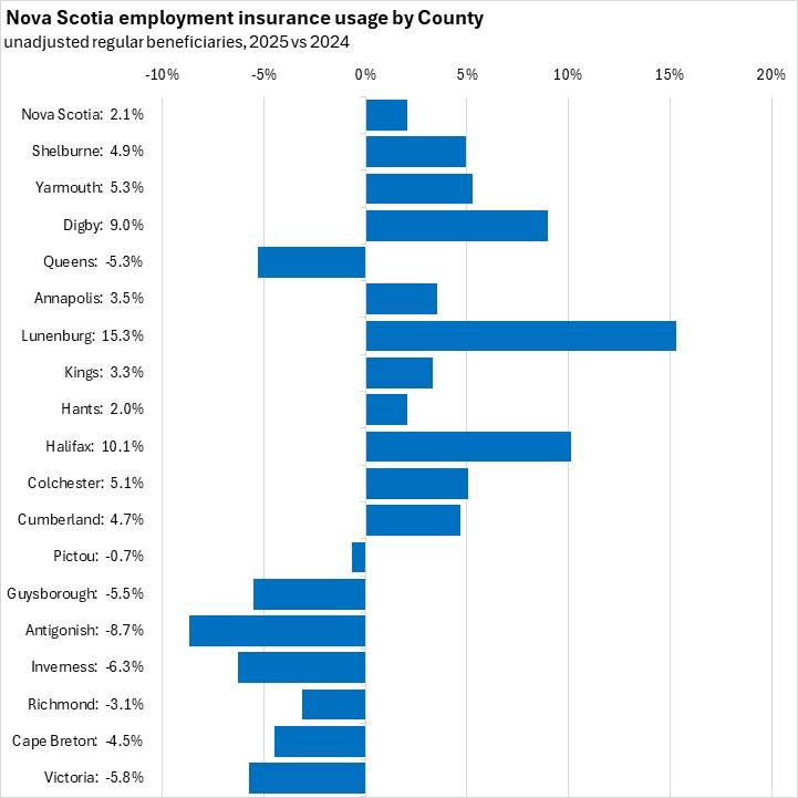 Comparing unadjusted regular beneficiaries for December 2025 against December 2024, the fastest growth in employment insurance usage (in percentage terms) was in Lunenburg county, followed by Halifax and Digby. The fastest decline was in Cape Breton county.