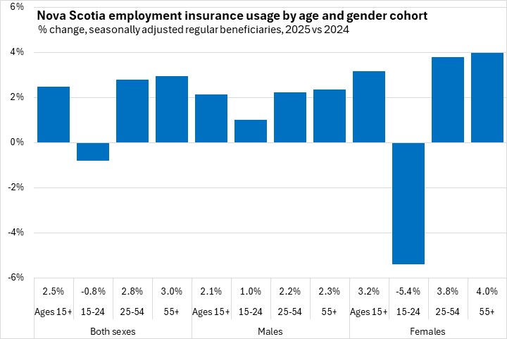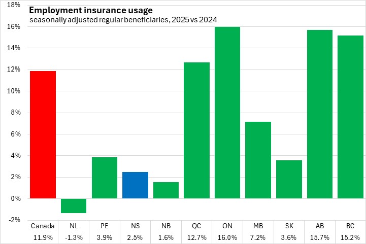 Compared to 2024, Nova Scotia's employment insurance usage increased 2.5%. National employment insurance usage increased 11.9% in 2025, with the fastest rise in Ontario. All provinces except Newfoundland and Labrador reported higher annual employment insurance usage.