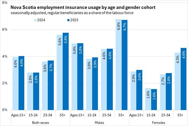 As a share of the labour force, employment insurance usage increased for core-aged and older females in 2025. There was a decline in employment insurance usage as a share of the labour force among females aged 15-24. Among males, employment insurance usage as a share of the labour force was largely stable across age cohorts, with a small decline in employment insurance usage for older workers, and a small increase for younger workers.