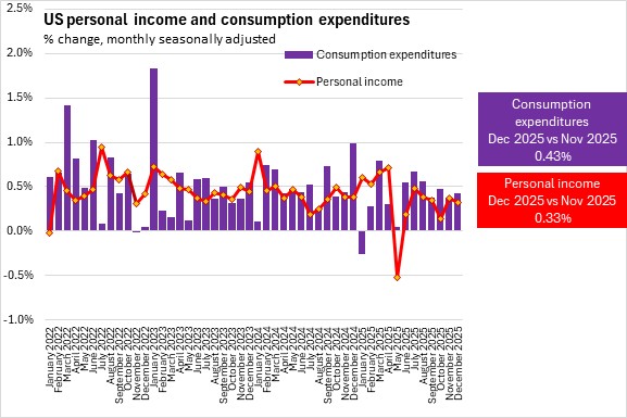 US personal income increased by $86.2 billion (+0.33%) from November to December. Employee compensation was up $30.9 billion (+0.19%). Personal disposable income was up $75.7 billion (+0.33%) while personal consumption expenditures (PCE) increased by $91.0 billion (+0.43%). US personal savings continued to decrease by falling $14.5 billion (-1.72%).