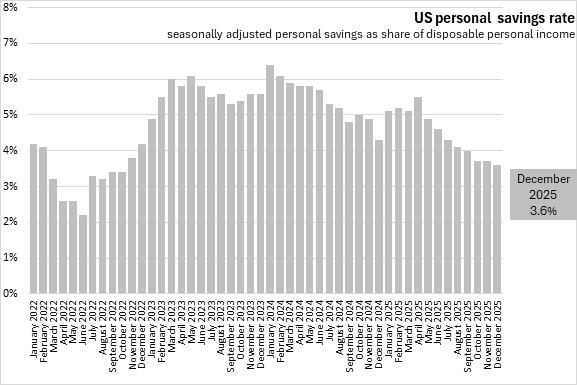 The US personal savings rate contracted to 3.6% of disposable personal income in December, the seventh decline in the last eight months.