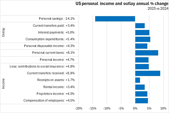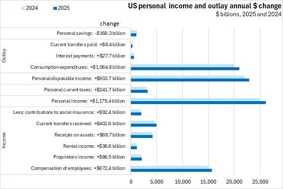 In 2025, US personal income increased by 4.7% over its value in 2024. There were gains from all income sources led by growth in current transfers received (+8.8%). Personal consumption expenditures grew by 5.4%. Personal savings declined 14.1%.