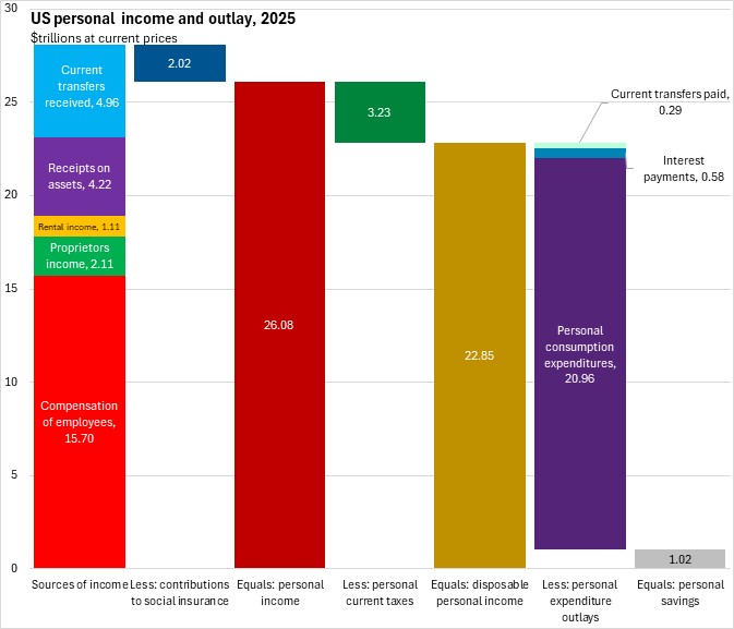 US personal income is calculated as the sum of employee compensation ($15.97 trillion), proprietors' income ($2.12 trillion), rental income ($1.11 trillion), receipts on assets ($4.25 trillion) and current transfers received ($5.11 trillion), less contributions to social insurance programs ($2.05 trillion). Personal income ($26.51 trillion) less personal current taxes ($3.32 trillion) equals disposable income ($23.19 trillion).