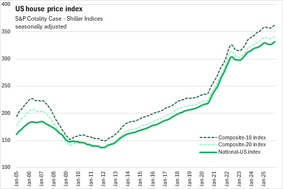 S&P Dow Jones Indices reports that US national house prices, as measured by the S&P Cotality Case - Shiller Indices increased by 0.4% from the previous month. The 20-city composite average and 10-city composite average were both up 0.5%.