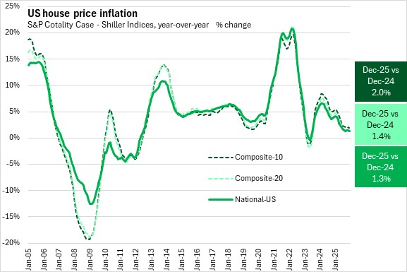 US national house prices rose by 2.3% in 2025 compared to 2024. The 20-city composite average was up 2.5% and the 10-city composite was up 3.1%.