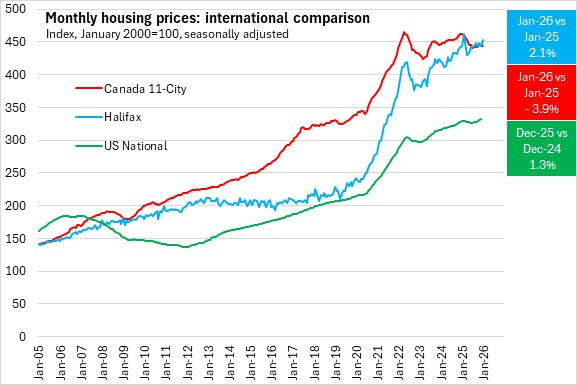 Canadian urban house price growth (measured by the Teranet-National Bank House Price Index) peaked in 2022, declined in 2023, peaked again in 2024, and had declined in 2025 (-3.9% year-over-year in January 2026). Halifax resale house prices also had peaks in 2022 and 2024, but exhibited a faster recovery over from corrections over the last 3 years.