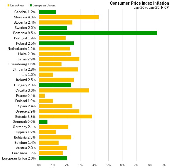 The inflation rate slowed to 2.0% in the European Union and to 1.7% in the Euro Area in January 2026.