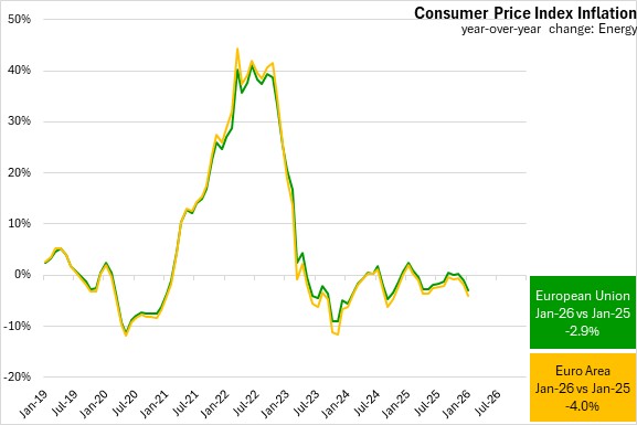 Energy price inflation was -2.9% in the European Union and -4.0% in the Euro Area in January 2026.