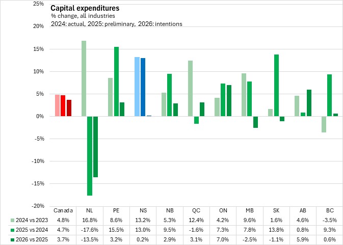 Nova Scotia's private capital expenditures were $3.40 billion in 2024, down 1.9% from 2023. Nova Scotia private capital expenditures increased by 10.3% to $3.79 billion in 2025 with investment intentions slated to grow to $3.90 billion (+2.9%) for 2026.