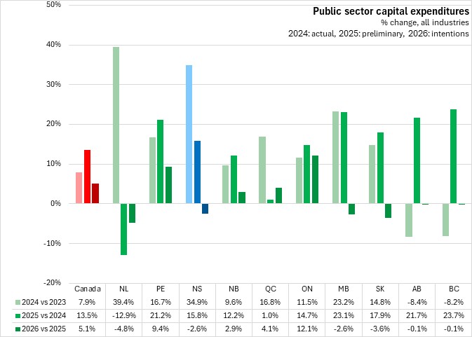 Nova Scotia's public capital expenditures reached $3.28 billion in 2024, up 34.9% from 2023 (second fastest growth among provinces). Public capital spending in Nova Scotia continued to grow with a further 15.8% increase in 2025, rising to $3.79 billion. For 2026, public capital expenditure intentions are expected to be $3.70 billion, a 2.6% decline over 2025.