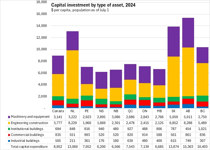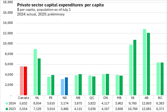 Nova Scotia's private capital expenditures were the lowest per capita values among provinces in each of 2024 and 2025. Private capital investments per capita were highest in Alberta, Saskatchewan and Newfoundland and Labrador.