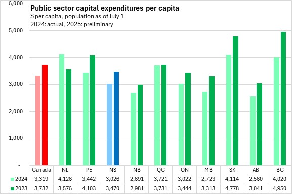Despite continued growth in capital expenditures, Nova Scotia reported the lowest per capita capital spending of any provinces in either 2024 or 2025. Capital expenditures per capita were notably higher in resource-producing provinces (Alberta, Saskatchewan and Newfoundland and Labrador) as well as in British Columbia.