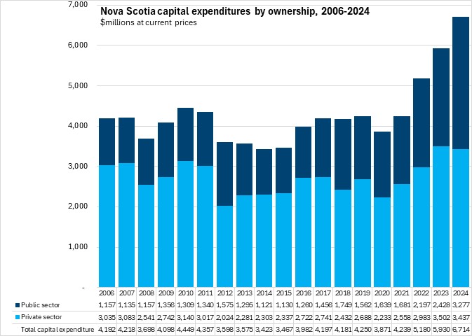 Nova Scotia's private capital expenditures peaked in 2023. Public capital expenditures in 2024 were nearly twice their levels in 2021.