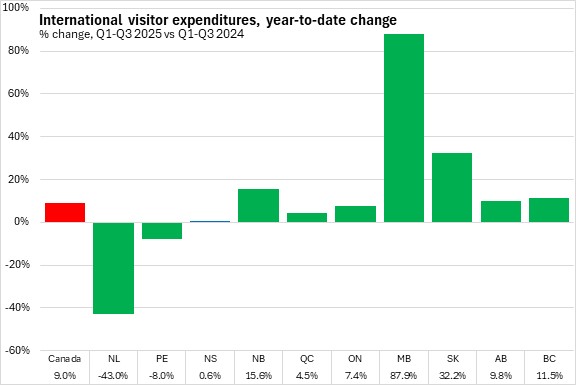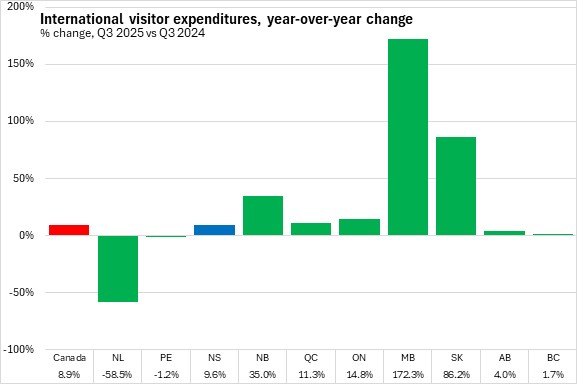 International visitor expenditures in Nova Scotia edged up 0.6% in the first three quarters of the year compared to the same period in 2024. Nationally, visitor expenditure increased 9.0% with gains in all provinces except Newfoundland and Labrador and Prince Edward Island. Manitoba had the largest gain in international visitor expenditures.