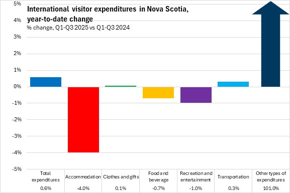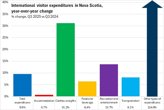Other types of expenditures reported the largest percentage gain in Nova Scotia's international visitor expenditures, followed by clothes and gifts. Gains were slower for international visitor spending on Nova Scotia accommodations in Q3 2025 compared to Q3 2024.