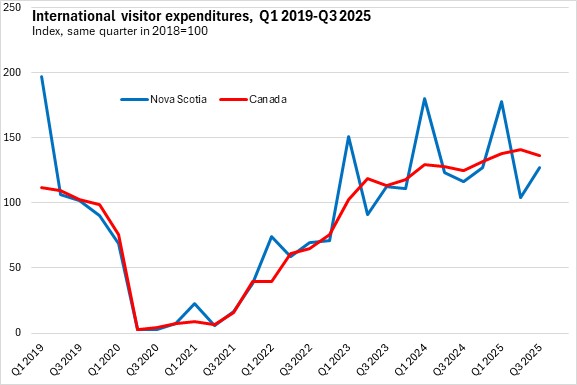 International travel expenditures have largely recovered to pre-pandemic levels in the last year, though some of this recovery includes the effects of rising prices. After a peak in the first quarter of 2024, international expenditures started to decline in Nova Scotia, before again rising in Q1 2025. In Q2 and Q3 2025, Nova Scotia's trend in international visitor expenditures fell below the national average. Canada's international expenditures continued trending up, but at a slower pace.
