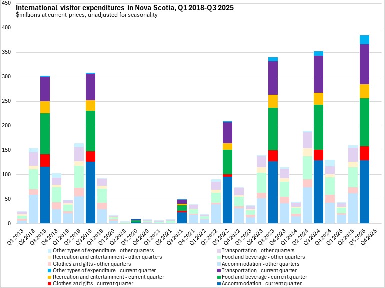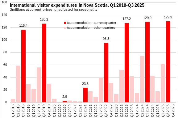 In unadjusted results by quarter, Nova Scotia's accommodations expenditures by international visitors were above previous levels for Q3.