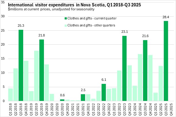 Clothing and gift spending by international visitors to Nova Scotia were substantially higher than previous Q3 results.