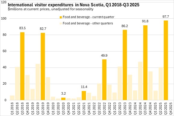 Food and beverage spending in Nova Scotia by international visitors continued to rise at a steady pace in Q3 2025.