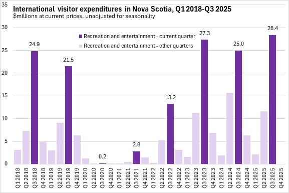 Recreation and entertainment spending in Nova Scotia by international visitors rebounded from a Q3 decline in 2024.