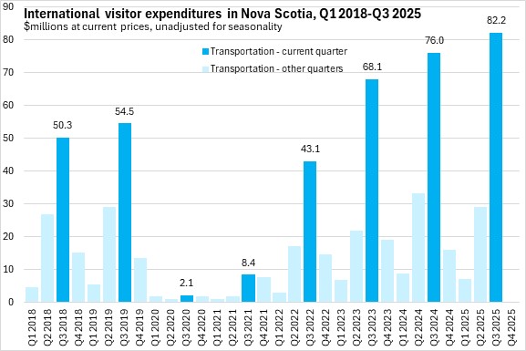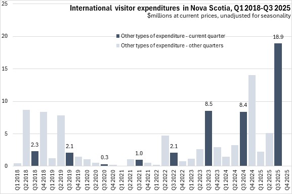 Other international visitor spending in Nova Scotia was more than double Q3 levels from 2023 and 2024.