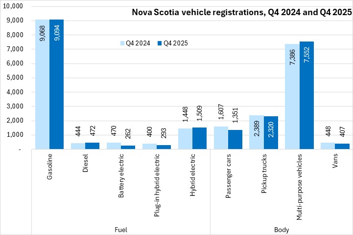 Registrations were up the most for diesel fueled vehicles (+6.3%) in Q4 2025 while battery electric (-44.3%) reported lower registrations than in Q4 2024. The overall decline in registrations was primarily due to lower registrations of plug-in hybrid and battery electric vehicles, partially offset by gains in other fuel types. Among body types, registrations were up for multi-purpose vehicles (+2.2%), with declines for all other body types in Nova Scotia from Q4 2024 to Q4 2025.