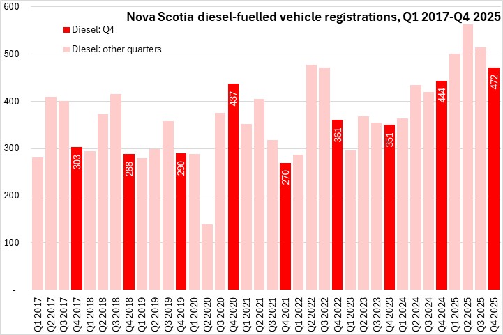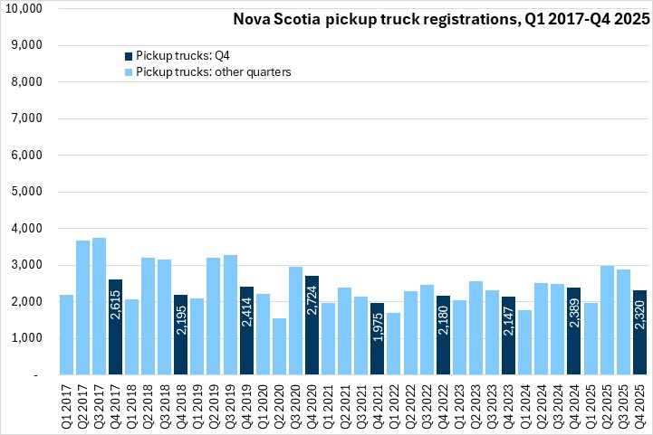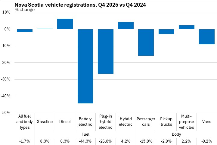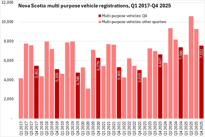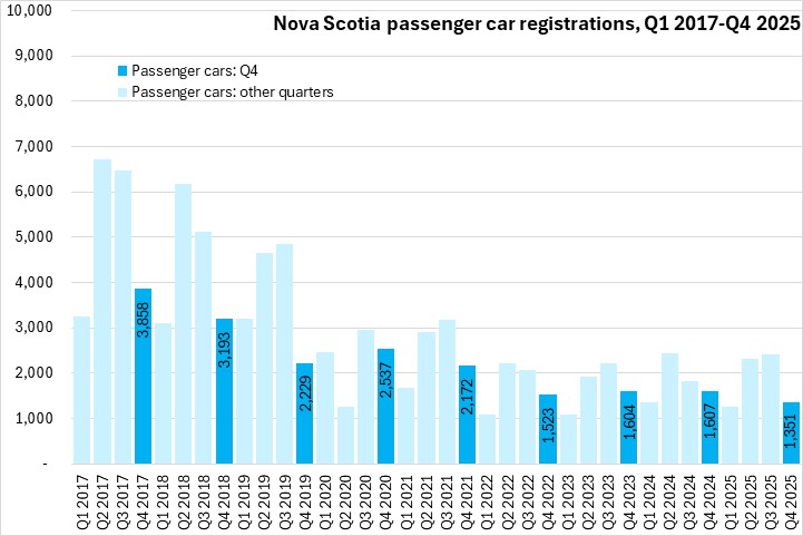 March 12, 2026NEW VEHICLE REGISTRATIONS, Q4 2025 Statistics Canada now reports Nova Scotia results for new motor vehicle registrations. Data are reported for all provinces except Newfoundland and Labrador and Alberta.