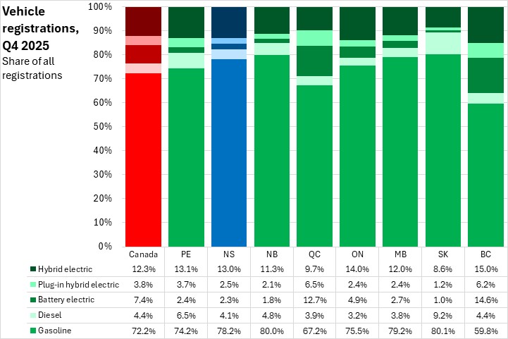 In Q4 2025, 78.2% of Nova Scotia's vehicle registrations were for gasoline-fuelled vehicles. Nationally, gasoline-fuelled vehicles were 72.2% of registrations in Q4 2025. British Columbia and Québec had the lowest shares of gasoline-fuelled vehicles among Q4 2025 registrations. Hybrid and battery electric vehicles were more commonly registered in British Columbia while Québec had the highest share of plug-in hybrid electric vehicles in its Q4 2025 registrations. Diesel vehicles were a larger share of registrations in Saskatchewan.