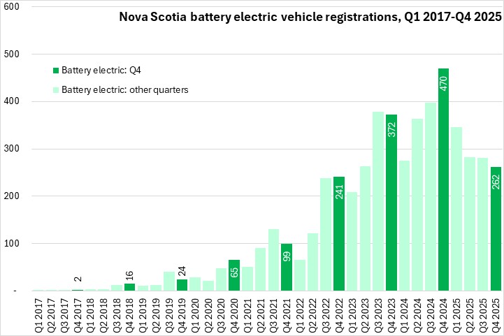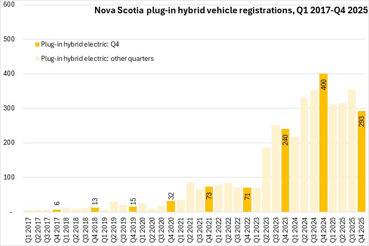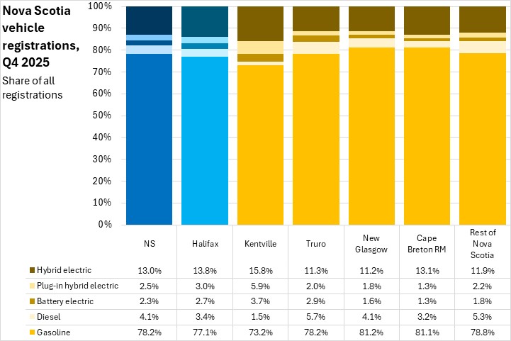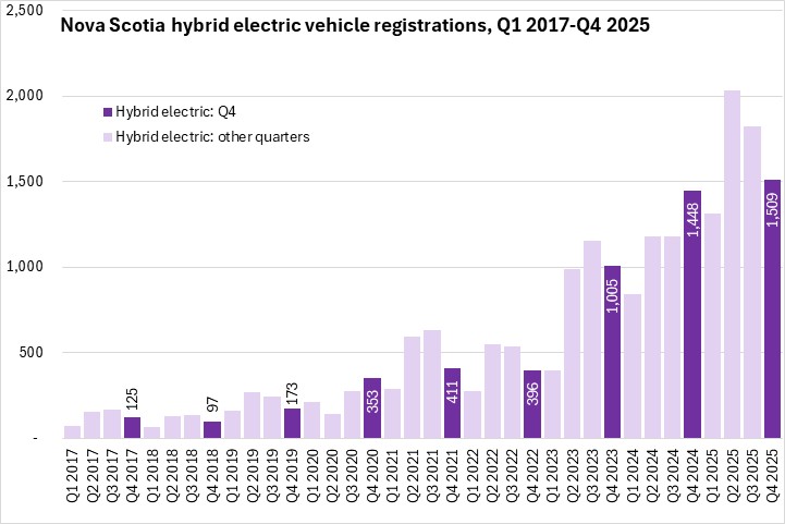Hybrid electric vehicle registrations have risen sharply in the last two years - making them the second most common type vehicle propulsion registered in Nova Scotia in Q4 2025.