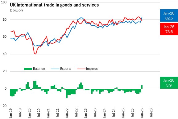 The UK goods and services trade balance changed from a deficit of £2.0 billion in January 2025 to a surplus of £3.9 billion in January 2026. The goods trade deficit narrowed by £2.7 billion and the services trade surplus widened by £3.1 billion.