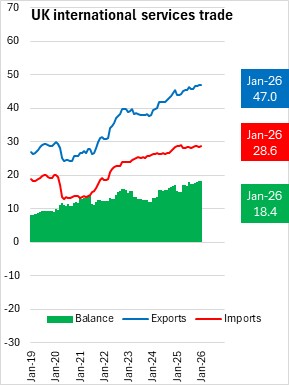 The UK services trade surplus was unchanged at £18.4 billion. Exports of services increased 0.2% (£0.1 billion) to £47.0 billion and imports of services increased 0.4% (£0.1 billion) to £28.6 billion.