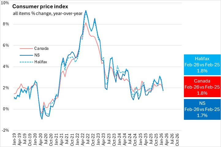 All items: Consumer prices in Nova Scotia were up 0.4% in February 2026 compared with January 2026. Nationally, consumer prices were up 0.5% compared to the previous month. In Halifax consumer prices were up 0.3%.