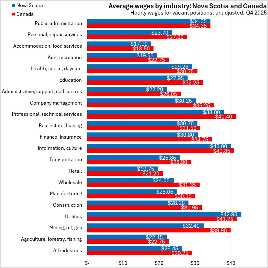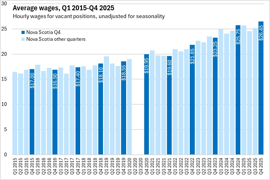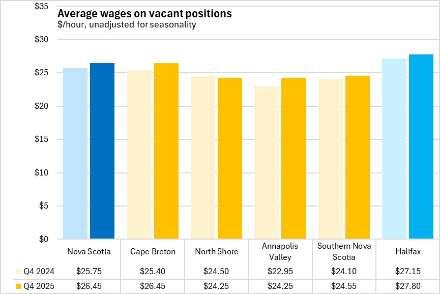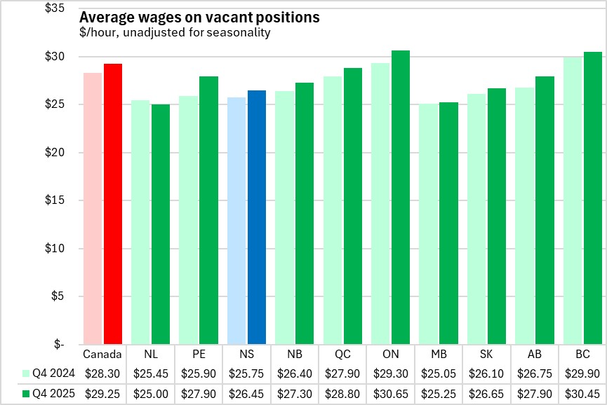The average hourly wage offered on vacant positions (unadjusted for seasonality) was $26.45 in Nova Scotia during Q4 2025, up from $25.75 a year earlier. All provinces, except Newfoundland and Labrador, reported higher average hourly wages on vacant positions compared with Q4 2024.
