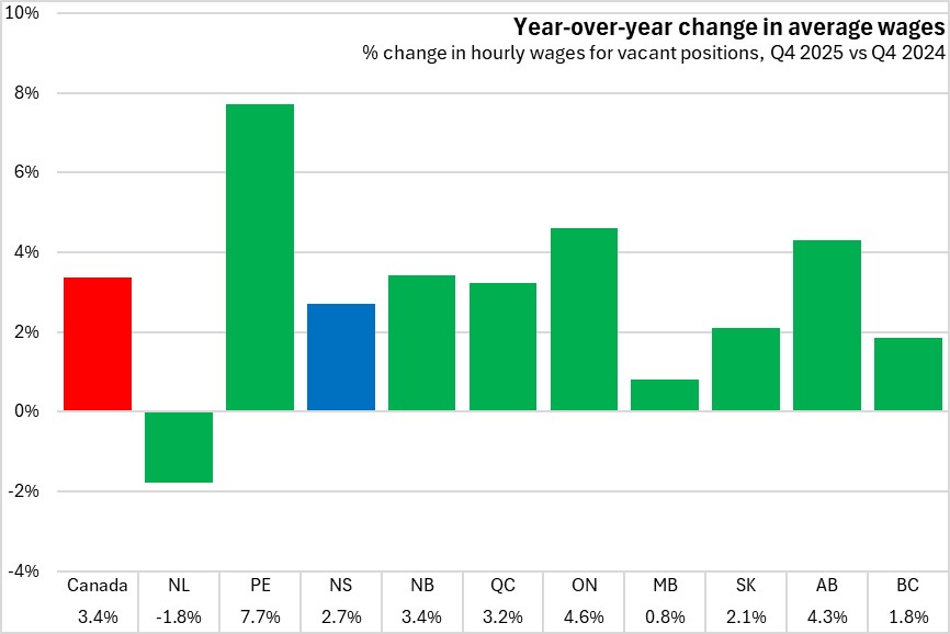Average wages on vacant positions grew by 2.7% in Nova Scotia from Q4 2024 to Q4 2025. Nationally, average wages on vacant positions were up 3.4% over this period with gains in all provinces, except Newfoundland and Labrador. Prince Edward Island reported the largest increase in average wages on vacant positions.