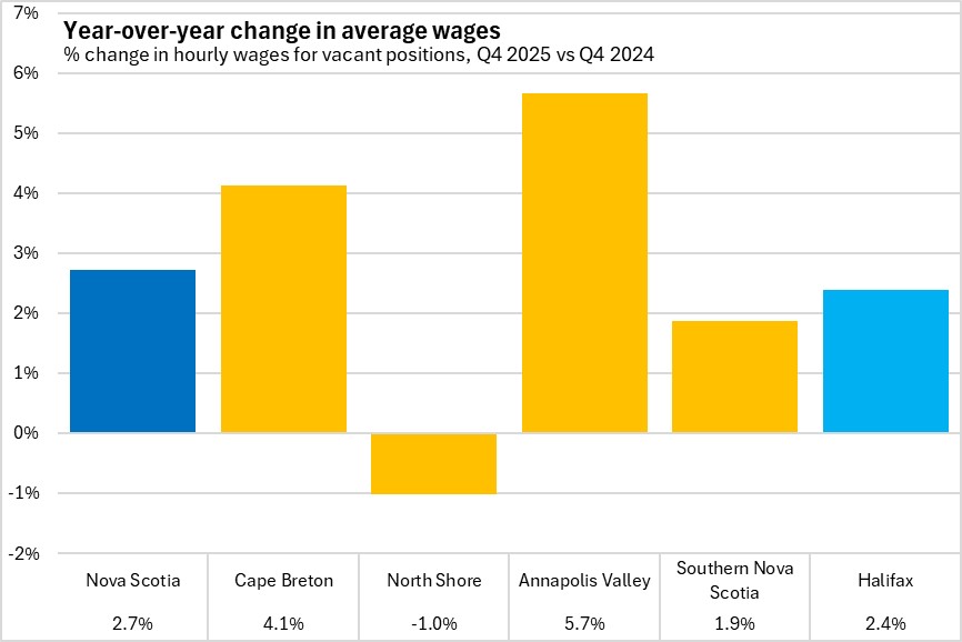 Across Nova Scotia, average hourly wages on vacant positions were up for all regions except North Shore. Q4 2025 wages were highest in Halifax and lowest in the North Shore and Annapolis Valley economic regions.