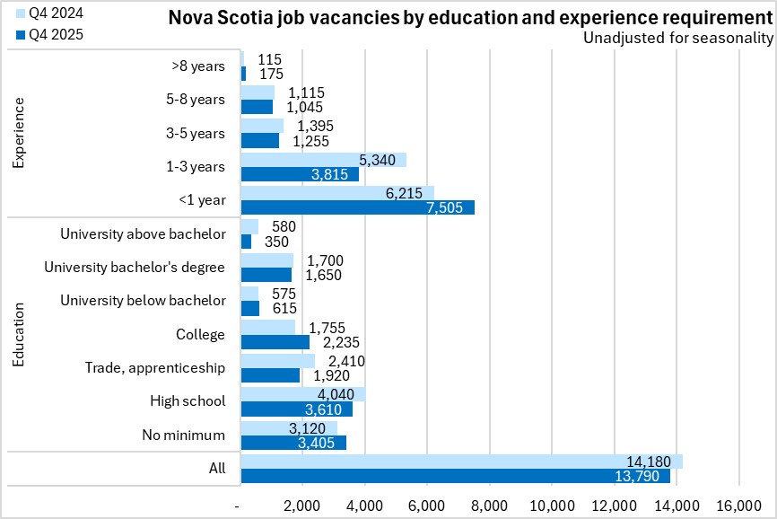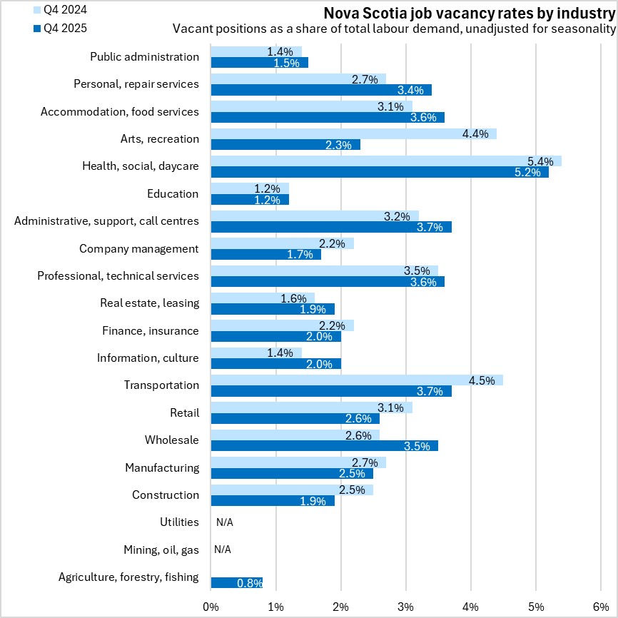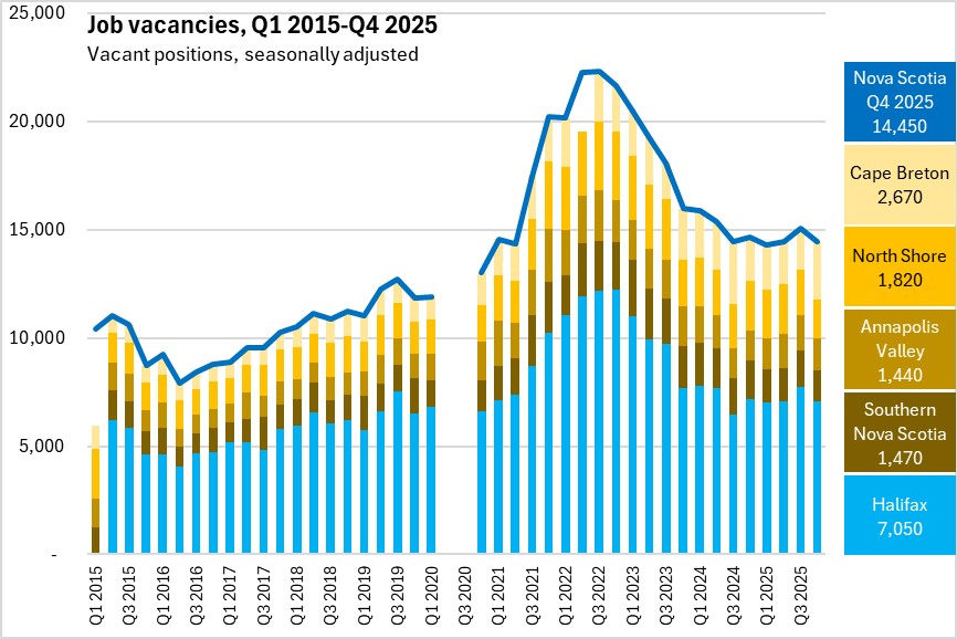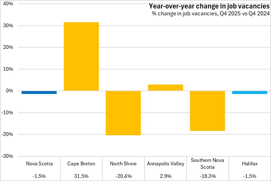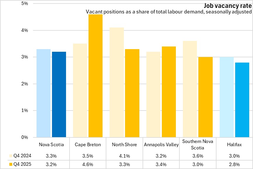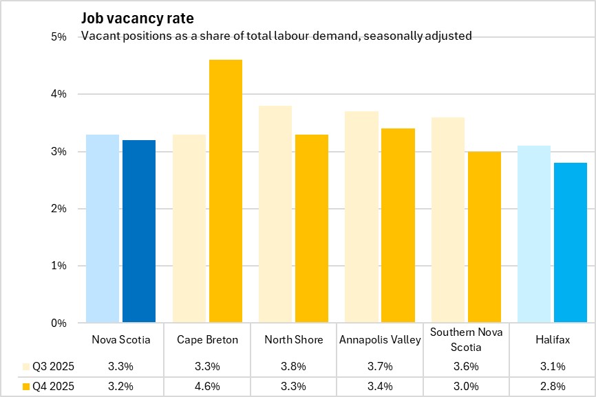 Within Nova Scotia, Cape Breton and Annapolis Valley were the only regions to report a higher job vacancy rate from Q4 2024 to Q4 2025.