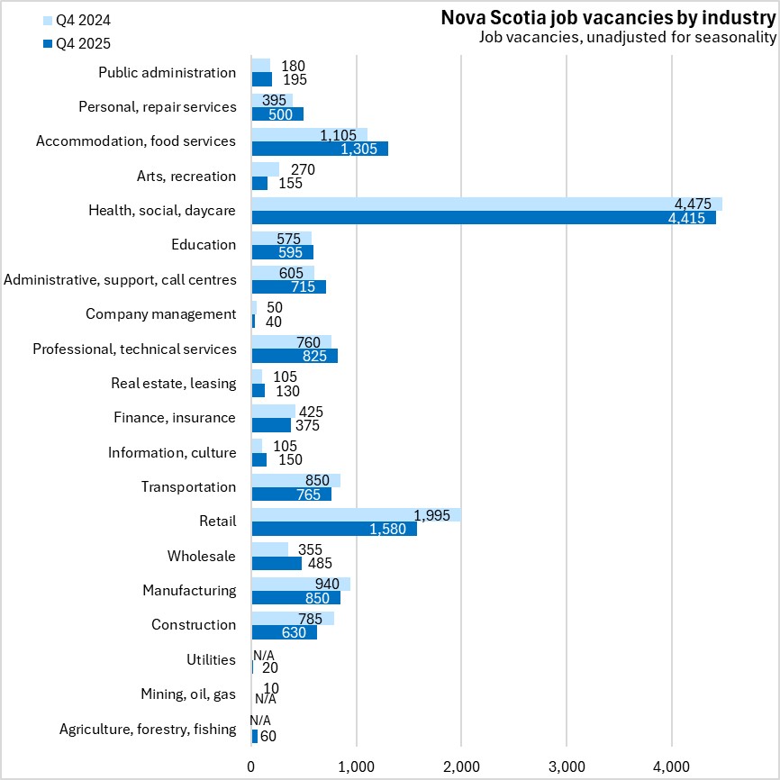 Despite a decline, the number of job vacancies remained highest in health/social/daycare in Nova Scotia in Q4 2025.