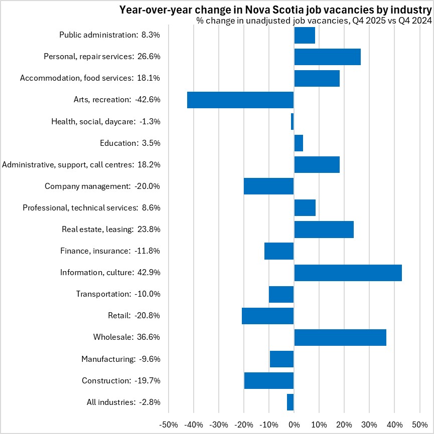 Compared with Q4 2024, there was a notable decline in the job vacancy rates for Nova Scotia's arts/recreation sector and a notable increase for wholesale vacancy rates.