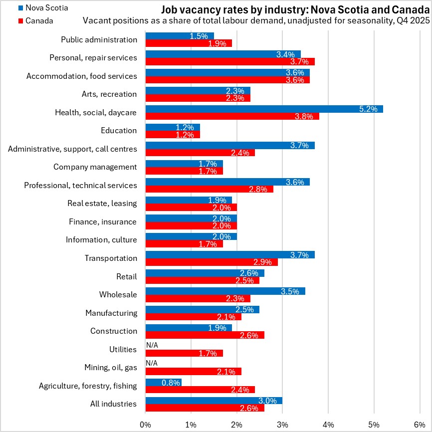 In unadjusted job vacancy rates by industry in Nova Scotia, health/social assistance/daycare reported the highest job vacancy rate in Q4 2025. Agriculture/forestry/fishing reported the lowest job vacancy rate. (Note: no data were available for utilities or mining/oil/gas for Q4 2025).